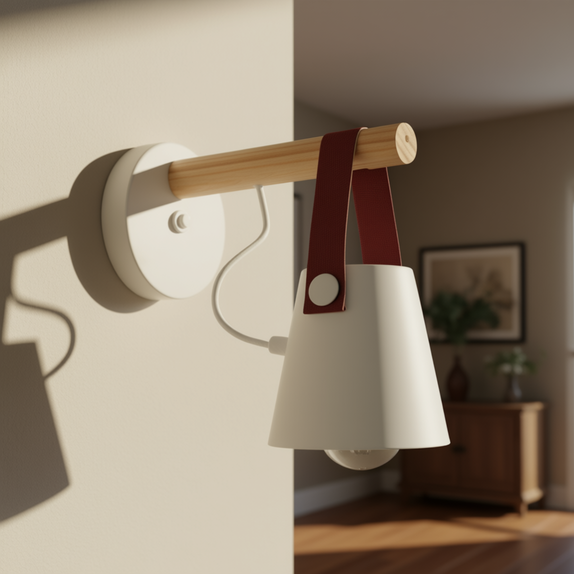 - Nombre: Aplique 1 Luz Campana de Chapa Blanca con Detalle en Cuero.