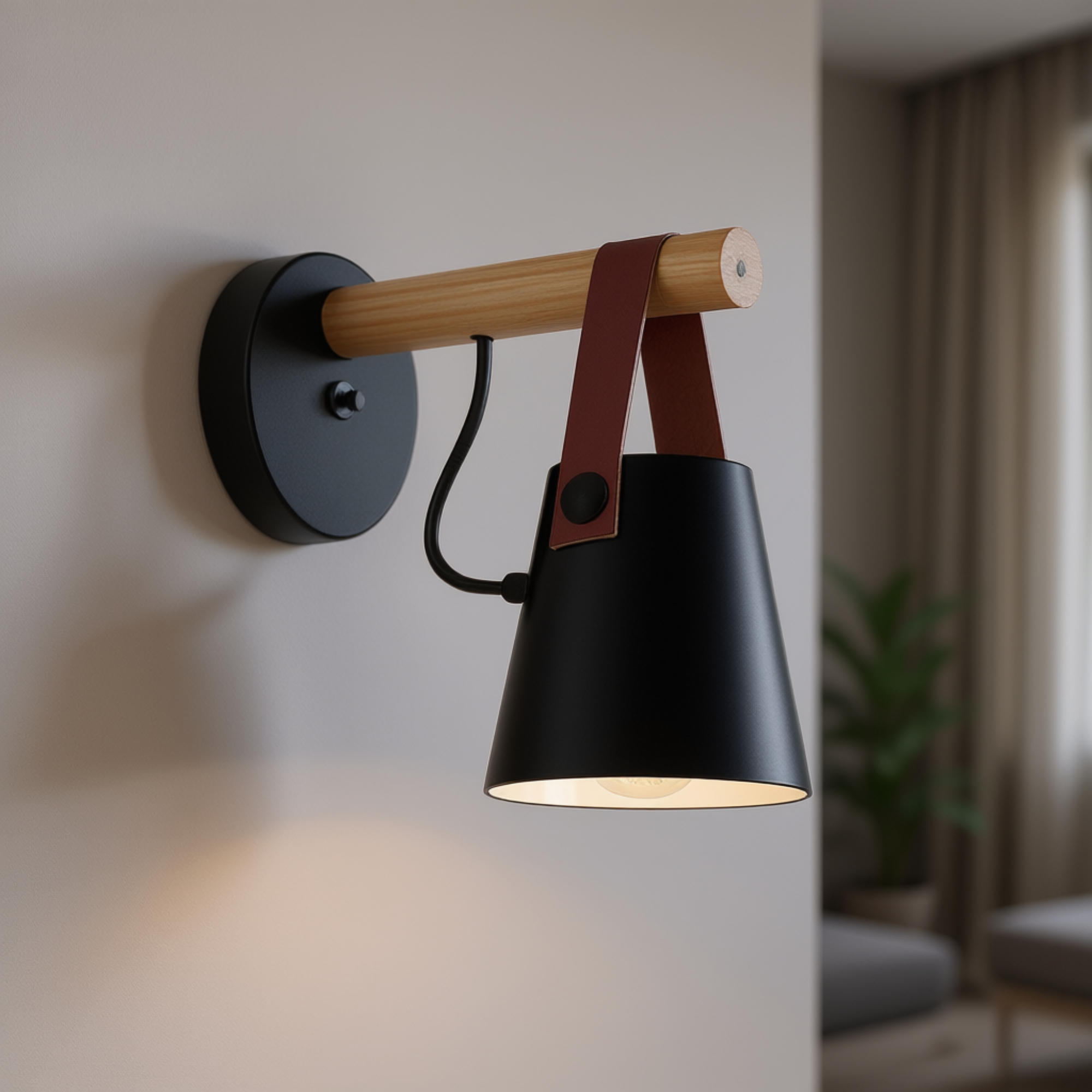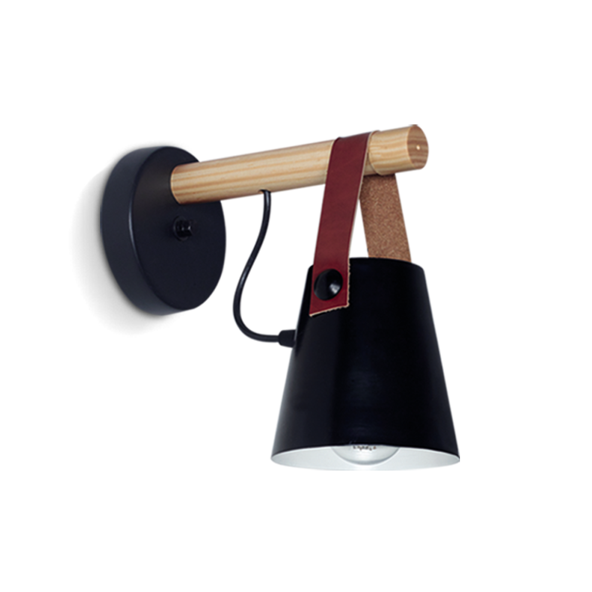 Aplique 1 Luz Campana de Chapa Negra con Detalle en Cuero