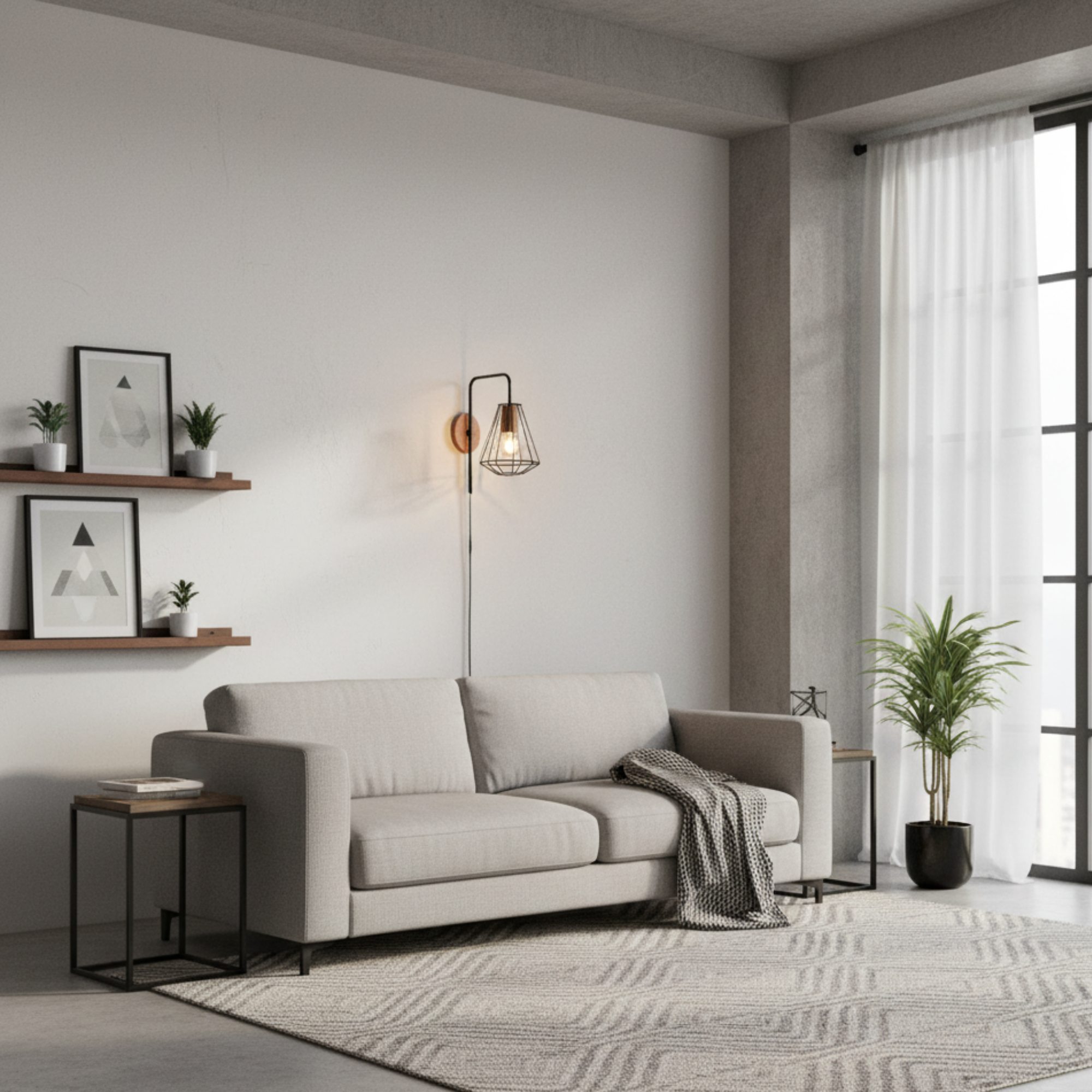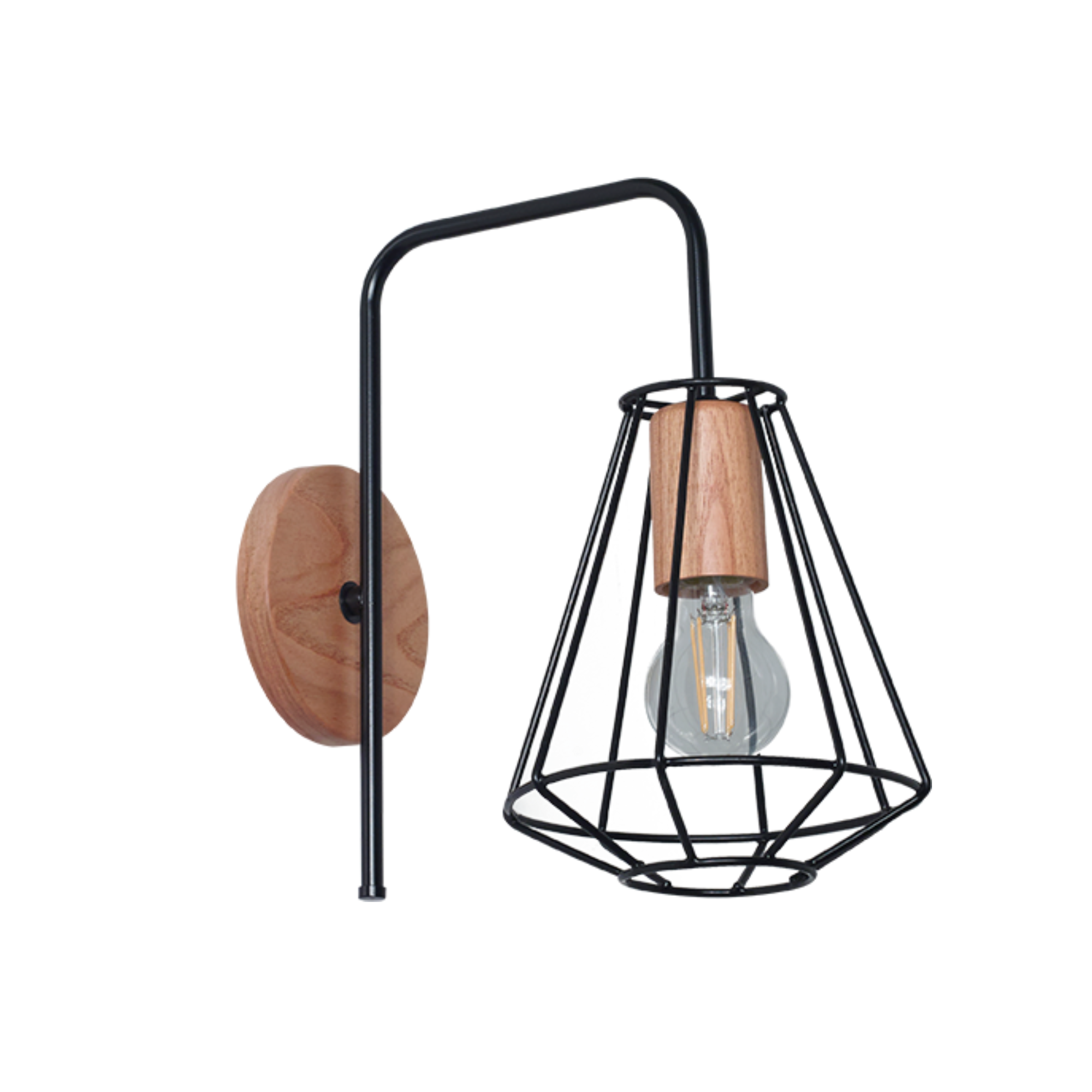 147071. Aportá un toque de estilo industrial-nórdico a tu decoración con este atractivo Aplique Jaulita Chica. Su diseño balancea la calidez orgánica de la madera paraíso en su base o brazo, con la estética robusta y geométrica de una jaula metálica en color negro, creando un contraste visual sofisticado. Con unas dimensiones de 32 cm de alto, 25 cm de ancho y 30 cm de largo, este aplique es ideal para iluminar un rincón de lectura, un cabecero o para ser colocado en serie a lo largo de un pasillo. La jaula no solo protege la lámpara, sino que también proyecta un patrón de luz y sombra que agrega profundidad y carácter al ambiente. Utiliza una lámpara con rosca E-27, lo que te permite elegir una ampolleta de filamento para realzar su estilo vintage (lámpara no incluida).