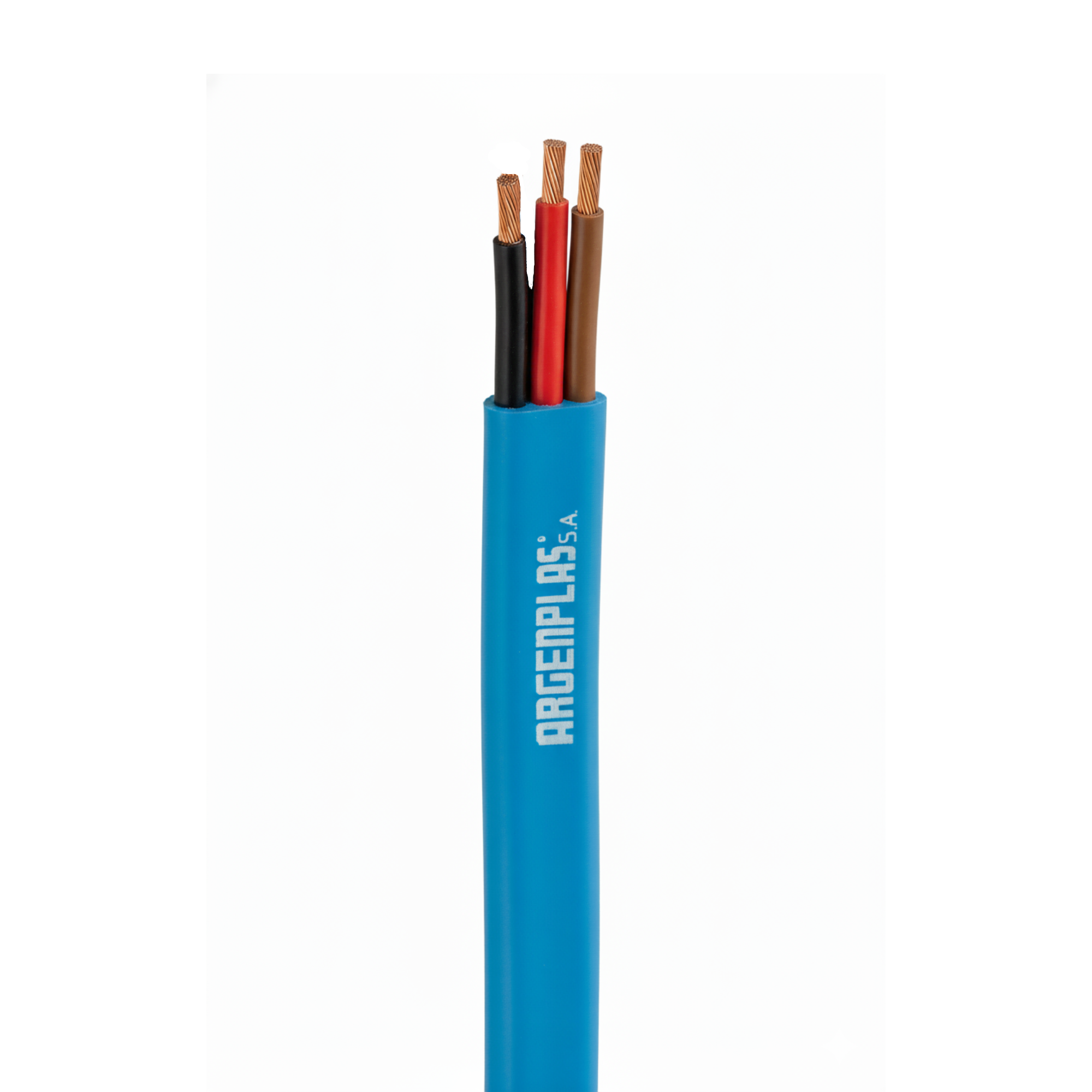 Este es un Cable Vaina Plana diseñado para el conexionado de todo tipo de bombas sumergibles. Los conductores están formados por cuerdas flexibles de alambres de cobre IRAM NM-280 clase 4 , aislados en PVC especial contra llama. Los conductores aislados se disponen en forma paralela , y el cable está disponible en versiones bipolares, trifásicas y tetrapolares. Por encima de los conductores se aplica una vaina de color celeste, también en PVC especial contra llama, que lleva un marcado secuencial metro a metro para facilitar el corte a medida exacta. El producto cumple con la norma IRAM 63007
