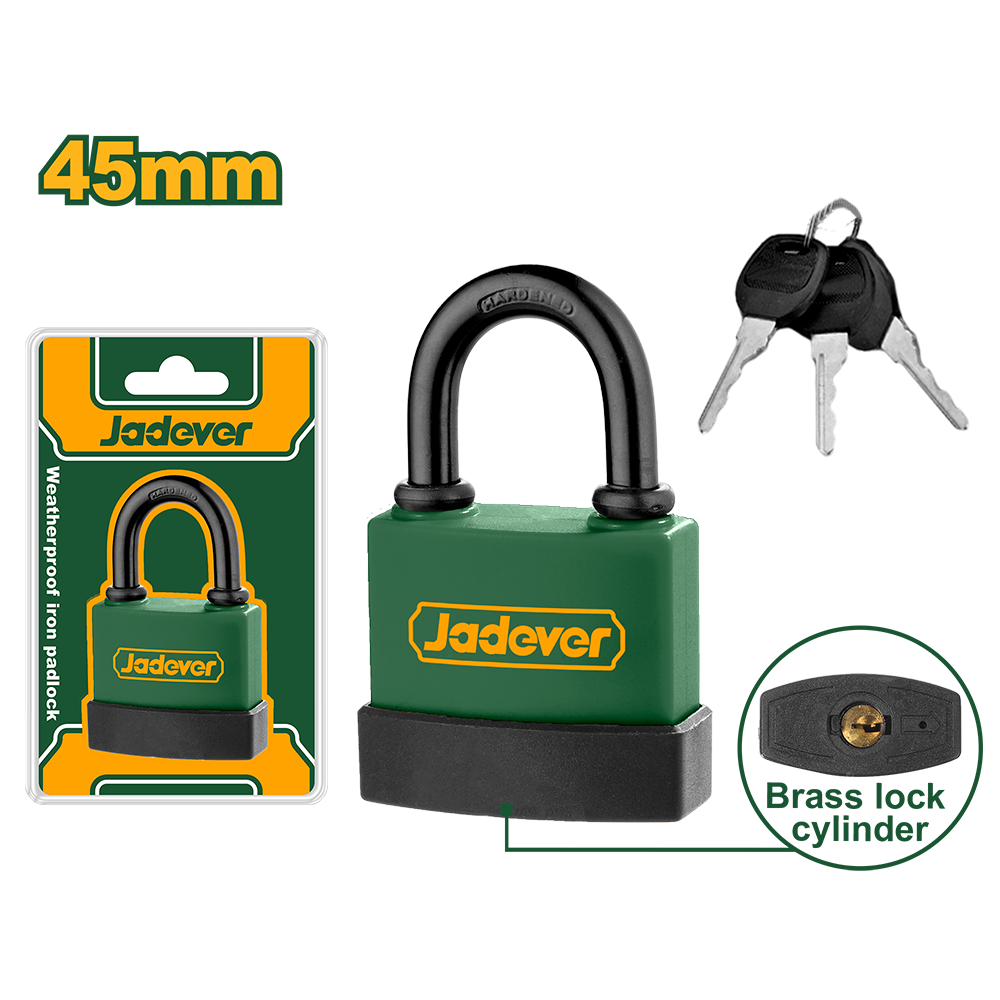 El candado Jadever modelo JDPD9445 ha sido diseñado para ofrecer una protección robusta en condiciones exigentes. Con un cuerpo de hierro macizo de 45 mm, este dispositivo proporciona una excelente resistencia contra intentos de rotura por impacto o palanca. Su recubrimiento especial lo hace apto para la intemperie, protegiendo el mecanismo interno contra la oxidación causada por la humedad, la lluvia y el polvo.
