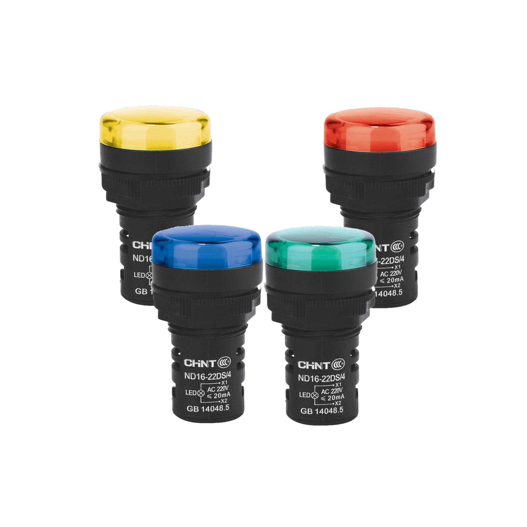 Nuestra selección de Ojos de Buey LED CHINT de 22mm para 220V incluye: 174250 (ND16-22C/4 230V-RED, Rojo), 174251 (ND16-22C/4 230V-YEL, Amarillo), 174252 (ND16-22C/4 220V BLU, Azul), y 174253 (ND16-22C/4230V-GRN, Verde).