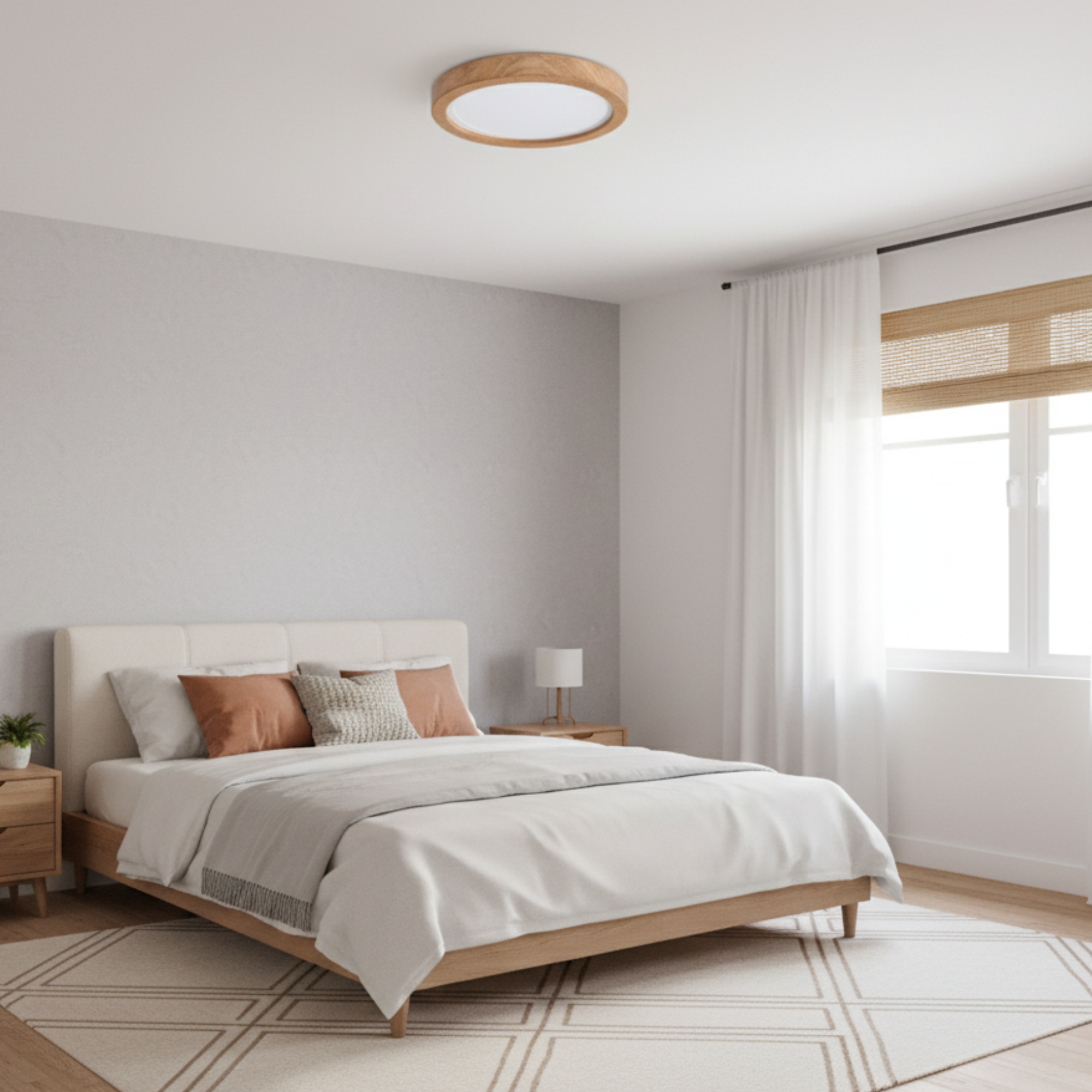 - Diseño: Plafón de techo circular con base de madera de roble.