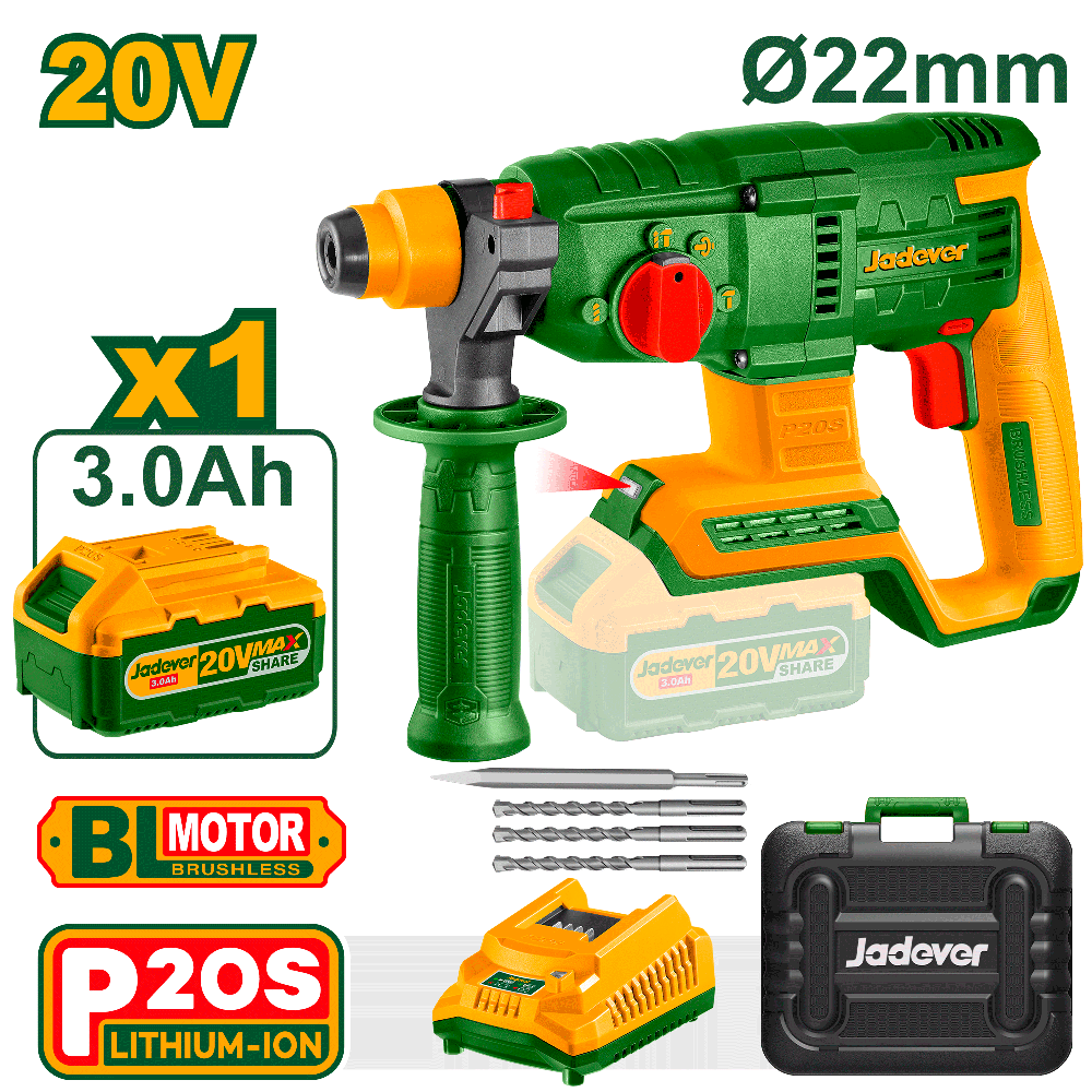 Este modelo cuenta con un selector de función dual (rotación y rotación con percusión), lo que lo hace versátil para trabajar también en madera o metal. Su diseño ergonómico y peso balanceado facilitan el uso en aplicaciones por encima de la cabeza o en espacios reducidos. Además, incorpora una luz LED de trabajo para mejorar la visibilidad en áreas oscuras. Al formar parte de la familia de 20V, la batería incluida es intercambiable con el resto de las herramientas inalámbricas de la línea Jadever, optimizando tu inversión en el taller.